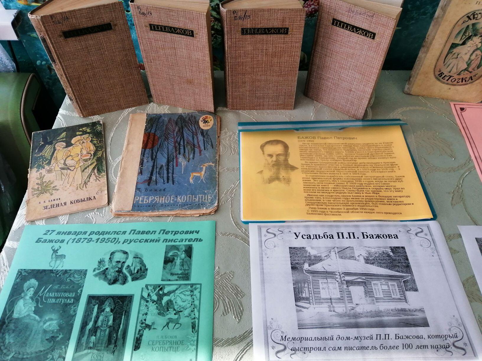 На выставке представлены следующие книги: «Серебряное копытце», «Хрупкая веточка», «Зелёная кобылка», «Сборник сочинений т. 1-3». Герои рассказов Павла Петровича простые люди, любящие своё дело, которые в своей жизни сталкиваются с необыкновенными событиями. Произведения П.П. Бажова с интересом читают как взрослые, так и дети.